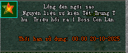 Chức Năng: Triệu Hồi 1 Dãy Lồng ĐènSau 5 phút sẽ triệu hồi boss . 10 phút không kích hoạt sẽ mất Chỉ sử dụng được ở các bản đồ 9x ( Trừ 5 Bản Đồ Thu Phí ) Boss có thể bí cướp . Kích hoạt cần 3xu + 10v |