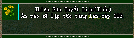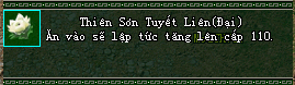 - Khi sử dụng : Thiên Sơn Tuyết Liên ( Tiểu ) Tăng Cấp 103 và nhận đại thành bí kíp - Khi sử dụng : Thiên Sơn Tuyết Liên ( Đại ) Tăng Cấp 110 và nhận đại thành bí kíp